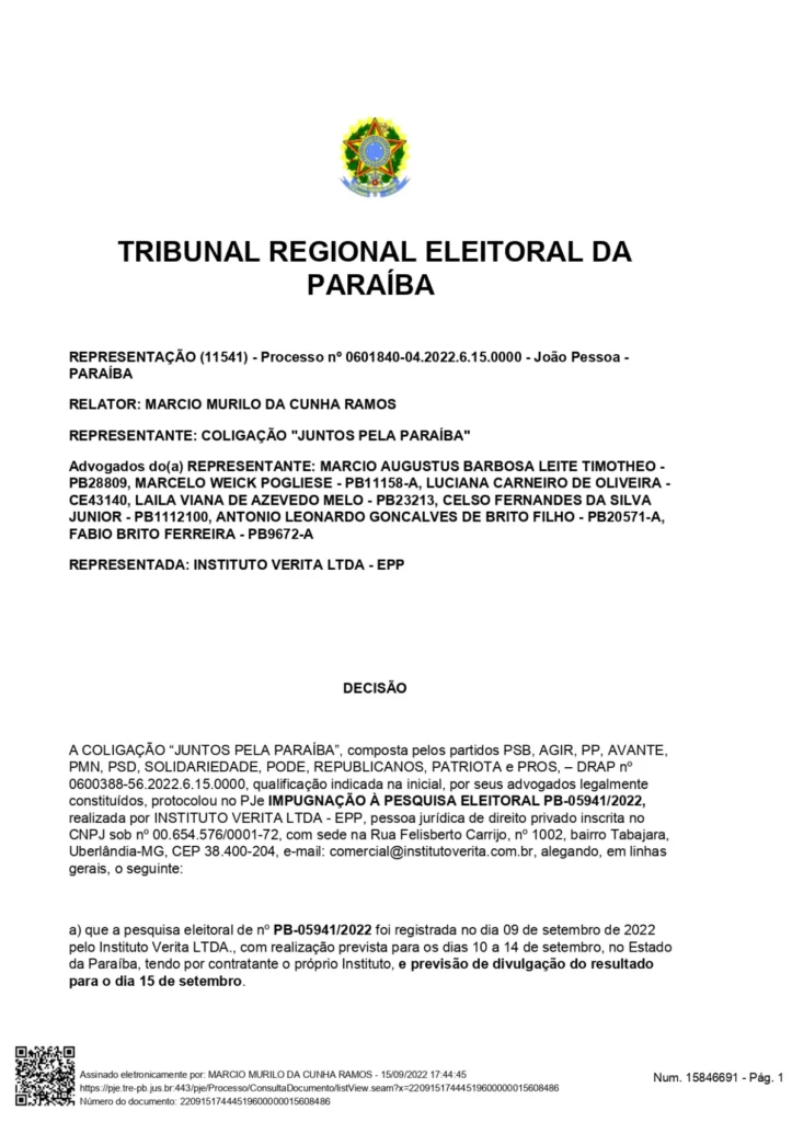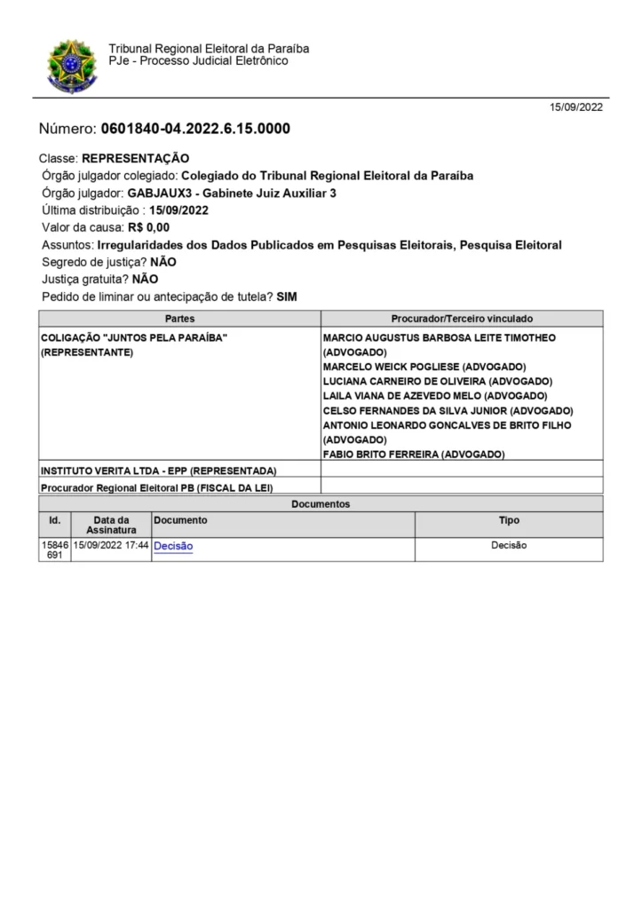 A representação contra o Instituto Veritá foi feita pela Coligação Juntos pela Paraíba, composta pelos partidos PSB, AGIR, PP, AVANTE, PMN, PSD, SOLIDARIEDADE, PODE, REPUBLICANOS, PATRIOTA e PROS. A pesquisa impugnada estava prevista para ser divulgada nesta quinta-feira (15).