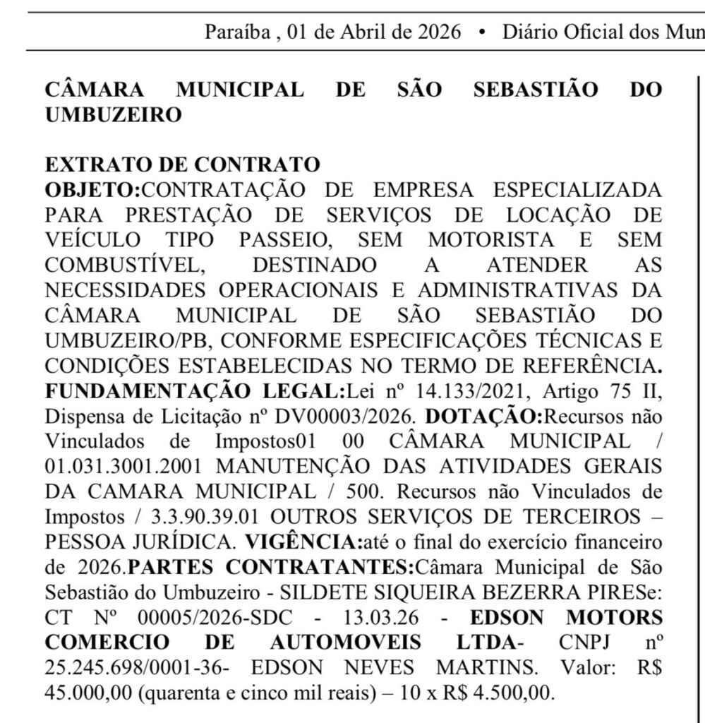 A informação foi apurada pelo portal Paraíba Mix e comprovada pela publicação no Diário Oficial onde o contrato firmado com a empresa Edson Motors Comércio de Automóveis Ltda, que prevê o pagamento mensal de R$ 4.500 por mês pelo aluguel de um carro de passeio, sem motorista e sem combustível. Ao final do período de apenas dez meses, o montante chega a R$ 45 mil , valor que, na prática, já se aproxima do custo de aquisição de um veículo popular.