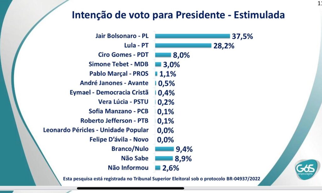 Pesquisa divulgada pelo Grupo 6 Sigma, divulgada nesta quinta-feira (11), mostra que o presidente Jair Bolsonaro (PL) lidera as intenções de voto, com 37,5%, seguido pelo ex-presidente Lula (PT), com 28%. A pesquisa foi realizada entre 1 e 5 de agosto de 2022.