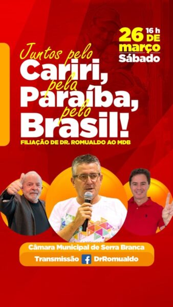 Após anunciar nos últimos dias a sua ida para o partido do MDB, o prefeito do Congo e pré-candidato a deputado estadual Dr. Romualdo Quirino, anunciou de forma oficial o evento que marcará a sua filiação ao partido que é comandado no estado pelo senador Veneziano Vital do Rêgo.