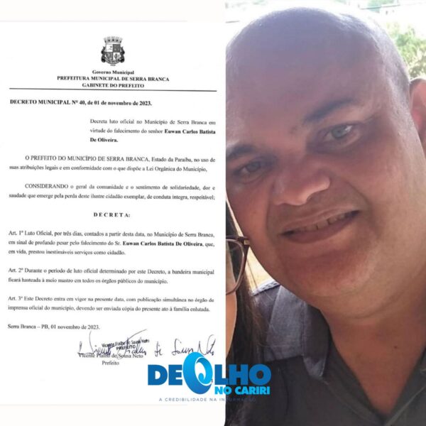 Prefeito de Serra Branca Souzinha decreta luto oficial pelo falecimento do Odontólogo e ex-vereador Drº Euwan Oliveira 1 de novembro de 2023