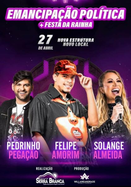 Solange Almeida, Felipe Amorim e Pedrinho Pegação são anunciados como atrações da 64ª Festa de Emancipação Política de Serra Branca – PB 6 de março de 2023