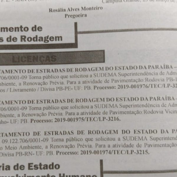 Governador pede a Sudema licença para acelerar pavimentação entre São José dos Cordeiros e Livramento 26 de março de 2019
