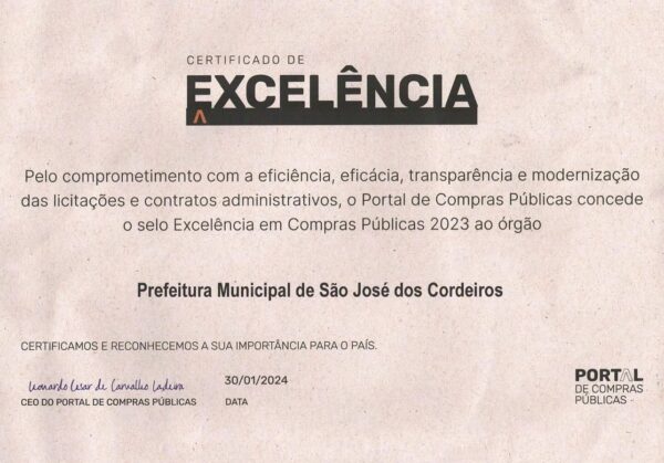 Prefeitura de São José dos Cordeiros recebe selo de excelência em Compras Públicas e prefeito comemora 21 de março de 2024
