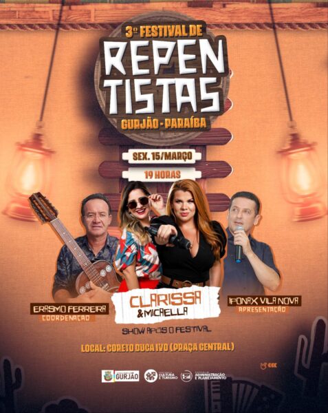 Prefeitura de Gurjão realiza nesta sexta-feira o 3º Festival de Repentistas do município 15 de março de 2024