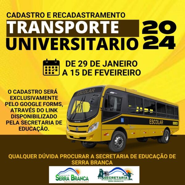 Secretaria de Educação de Serra Branca inicia cadastro para transporte universitário 2024 31 de janeiro de 2024