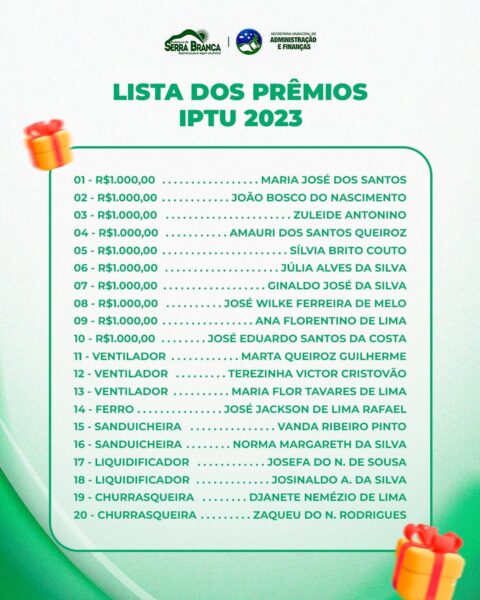 Prefeitura de Serra Branca realiza sorteio da Campanha Meu IPTU Vale Prêmios 2023 2 de fevereiro de 2024