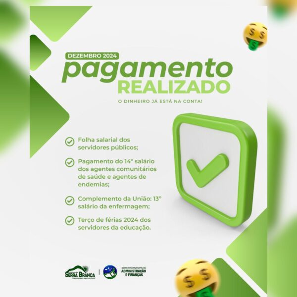 Prefeitura de Serra Branca efetua pagamento do 14º salário, complemento do 13º, terço de férias e folha de servidores 20 de dezembro de 2024