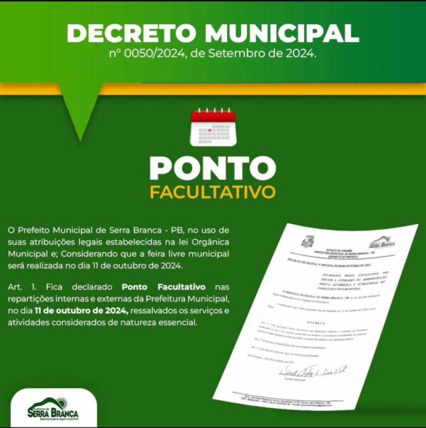 Prefeitura de Serra Branca decreta ponto facultativo no dia 11 de outubro, véspera do feriado de Nossa Sra. Aparecida 9 de outubro de 2024