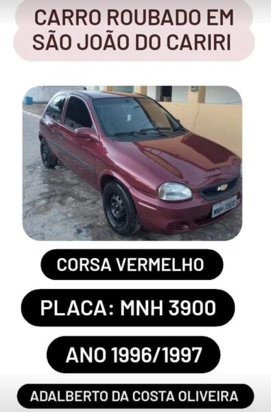 Veículo é furtado em pleno centro de São João do Cariri durante festa do aniversário da cidade 7 de maio de 2022