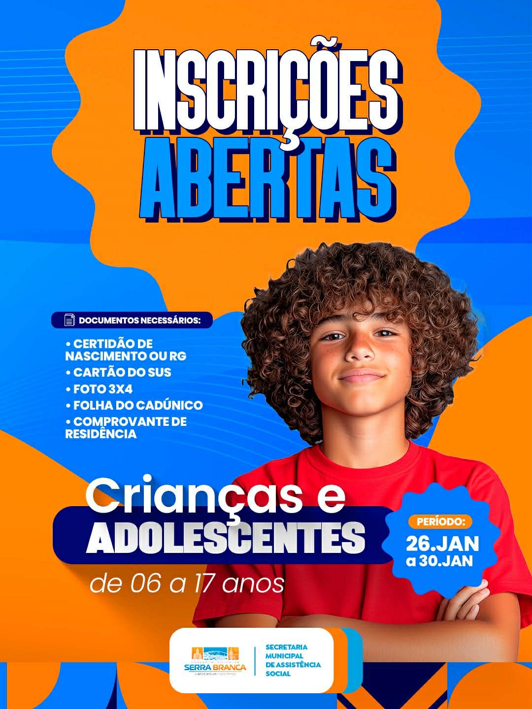 A Prefeitura Municipal de Serra Branca, por meio da Secretaria Municipal de Assistência Social, informa que estão abertas as inscrições, no período de 26 a 30 de janeiro, para crianças e adolescentes com idades entre 6 e 17 anos que desejam participar do Serviço de Convivência e Fortalecimento de Vínculos (SCFV) no município. O SCFV […]