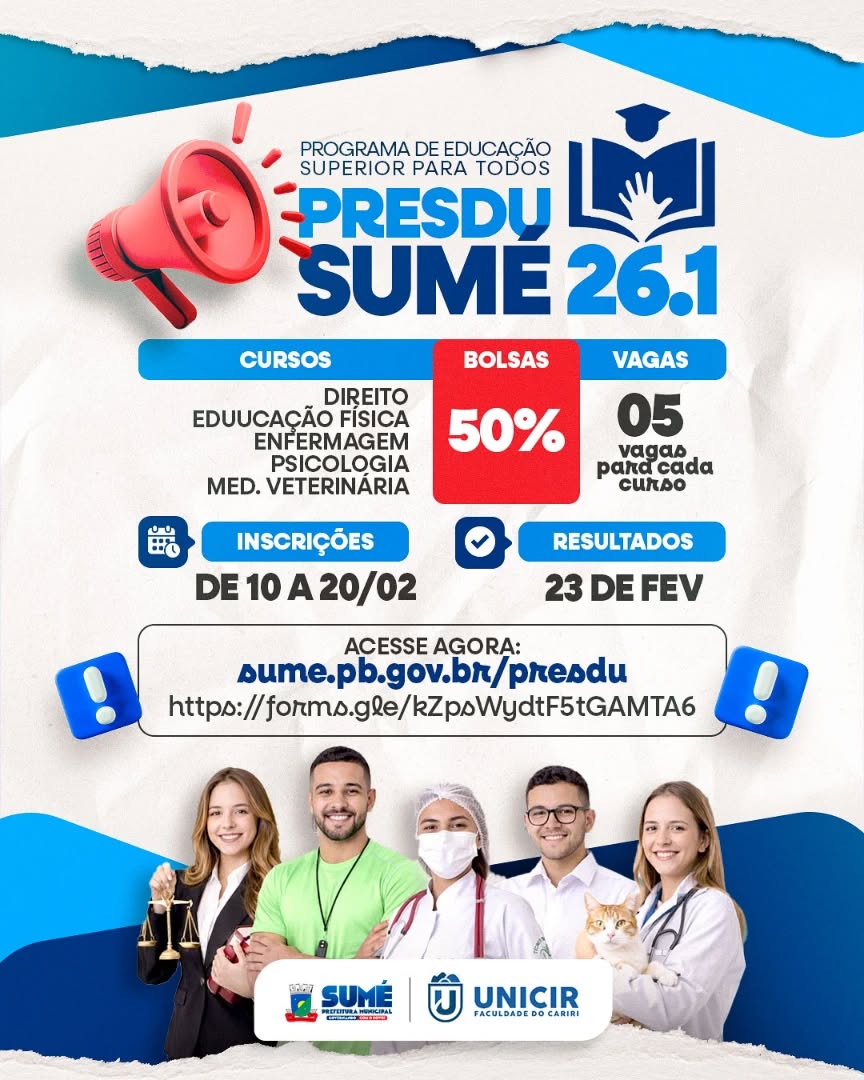 Prefeitura de Sumé e Unicir abrem inscrições para cursos superiores com bolsas de 50% de desconto por meio do Presdu